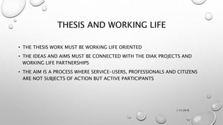This document outlines the thesis process for the Degree Programme in Social Services (A41DSS) curriculum at DIAK. It discusses that the thesis work must be oriented towards working life by connecting ideas and aims to DIAK projects and partnerships. The goal is for a process where service-users, professionals and citizens actively participate rather than being passive subjects. It describes the basics of the thesis process including choosing a topic connected to work life, conducting research, collecting data, and producing a project or product. It lists the parts of the thesis process as an idea paper, thesis proposal, and manuscript. Finally, it directs students to read a guide book on community-based participatory research and the bachelor's thesis process.