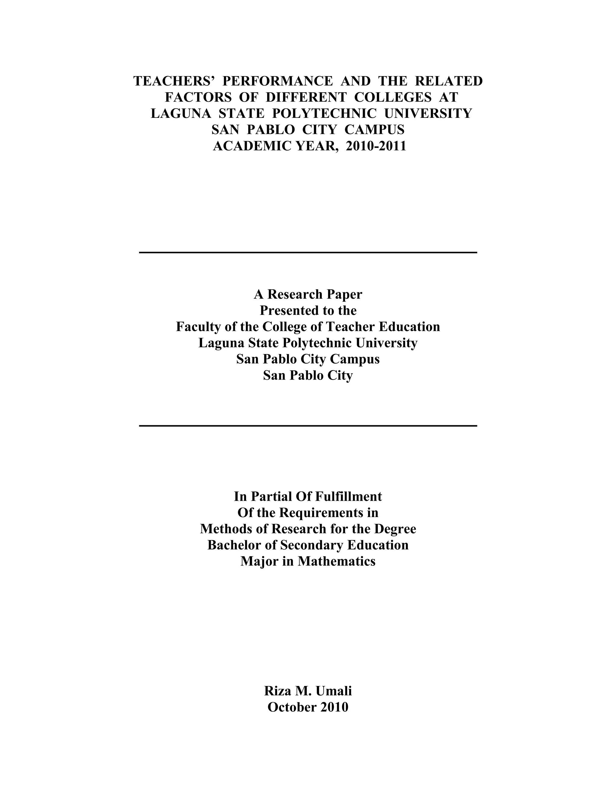 This document is a research paper that examines teachers' performance and related factors across different colleges at Laguna State Polytechnic University in the Philippines. It outlines the background of the study, statement of the problem, significance of the study, scope and limitations, conceptual framework, and hypotheses. Specifically, it aims to understand the profile of teachers, their perceived commitment, subject knowledge, teaching strategies, and management of learning, as well as the relationship between these factors and teacher performance.