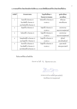 เรื่อง กําหนดสงเอกสารวิทยานิพนธของนิสิตหลักสูตรสาธารณสุขศาสตรมหาบัณฑิต ประจําภาคตน ปการศึกษา 2553 ------------------------------------- เพื่อใหการบริหารงานระดับบัณฑิตศึกษา หลักสูตรสาธารณสุขศาสตรมหาบัณฑิต ประจําภาคตน ปการศึกษา 2553 ดําเนินไปดวยความเรียบรอย สรางโอกาสใหแกอาจารย และนิสิตไดดําเนินการศึกษาตาม หลักสูตรไดอยางมีประสิทธิภาพ จึงประกาศใหนิสิตหลักสูตรสาธารณสุขศาสตรมหาบัณฑิต ที่ประสงคจะสง เอกสารเกี่ยวกับการขอสอบเคาโครงวิทยานิพนธและสอบปากเปลาวิทยานิพนธ ใหปฏิบัติตามประกาศฯ ราย ละเอียดดังนี้ 1. การสอบปากเปลาวิทยานิพนธ ลําดับที่ กําหนดการสอบ วันสุดทายที่คณะฯ สถานที่สอบ รับเอกสารการขอสอบ 1 วันพุธที่ 4 สิงหาคม 53 วันพุธที่ 28 กรกฎาคม 53 มหาสารคาม/ และวันพฤหัสบดีที่ 5 สิงหาคม 53 (16.00 น.) คณะสาธารณสุขศาสตร 2 วันพฤหัสบดีที่ 12 สิงหาคม 53 วันพฤหัสบดีที่ 5 สิงหาคม 53 สสอ.ลําปลายมาศ/ วันศุกรที่ 13 สิงหาคม 53 (16.00 น.) บุรีรัมย วันเสารที่ 14 สิงหาคม 53 3 วันอาทิตยที่ 15 สิงหาคม 53 วันพฤหัสบดีที่ 5 สิงหาคม 53 สุรินทร/ (16.00 น.) สสอ.เมืองสุรินทร 4 วันศุกรที่ 20 สิงหาคม 53 วันพุธที่ 11 สิงหาคม 53 สุพรรณบุรี/ วันเสารที่ 21 สิงหาคม 53 (16.00 น.) วสส.สุพรรณบุรี และวันอาทิตยที่ 22 สิงหาคม 53 5 วันจันทรที่ 23 สิงหาคม 53 วันพุธที่ 11 สิงหาคม 53 สุรินทร/ (16.00 น.) สสอ.เมืองสุรินทร 6 วันจันทรที่ 30 สิงหาคม 53 วันจันทรท่ี 23 สิงหาคม 53 สุรินทร/ (16.00 น.) สสอ.เมืองสุรินทร 7 วันพฤหัสบดีที่ 2 กันยายน 53 วันจันทรท่ี 23 สิงหาคม 53 ศรีสะเกษ/ และวันศุกรที่ 3 กันยายน 53 (16.00 น.) สสจ.ศรีสะเกษ 2. การสอบเคาโครง............./