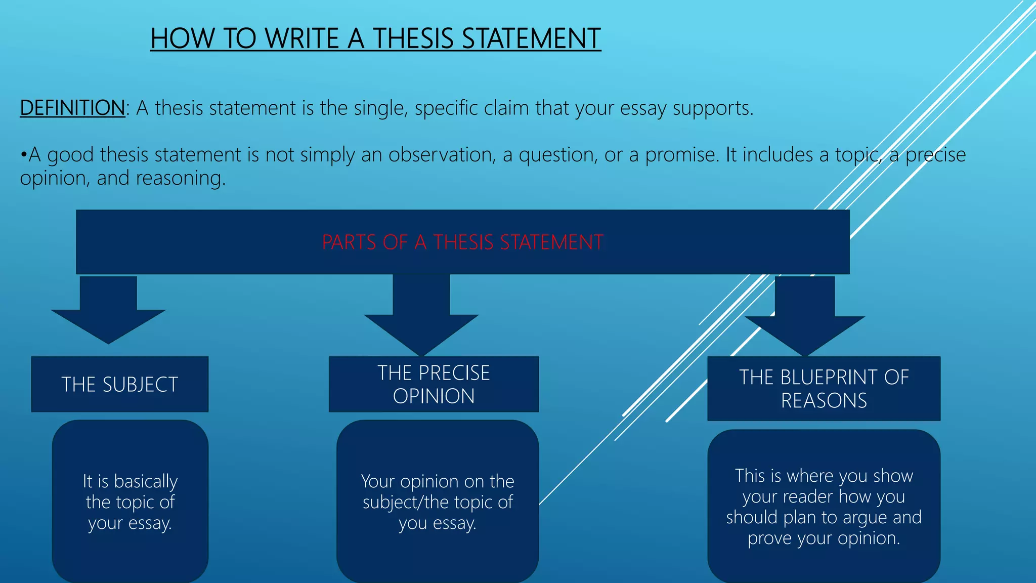 The document provides instructions on how to write an effective thesis statement. It explains that a thesis statement has three key parts: the topic, a precise opinion on the topic, and reasons to support that opinion. It emphasizes that a good thesis statement is arguable and includes three pieces of evidence or reasons. The document also provides an example thesis statement on the topic of hip hop music and how it positively influences youth. It concludes by noting that an effective thesis statement tells the reader the topic that will be discussed and the argument or claim that will be made, supported by reasons.