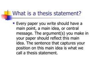 The document provides guidance on writing an effective thesis statement. It defines a thesis statement as announcing the topic and reflecting an opinion or judgment about that topic. An effective thesis statement is specific, focused on a narrow scope, and includes the writer's position. It should be presented early in the paper to provide direction. The document offers tips for crafting a clear, original thesis statement that announces the topic and the writer's non-obvious perspective in 1-2 sentences.