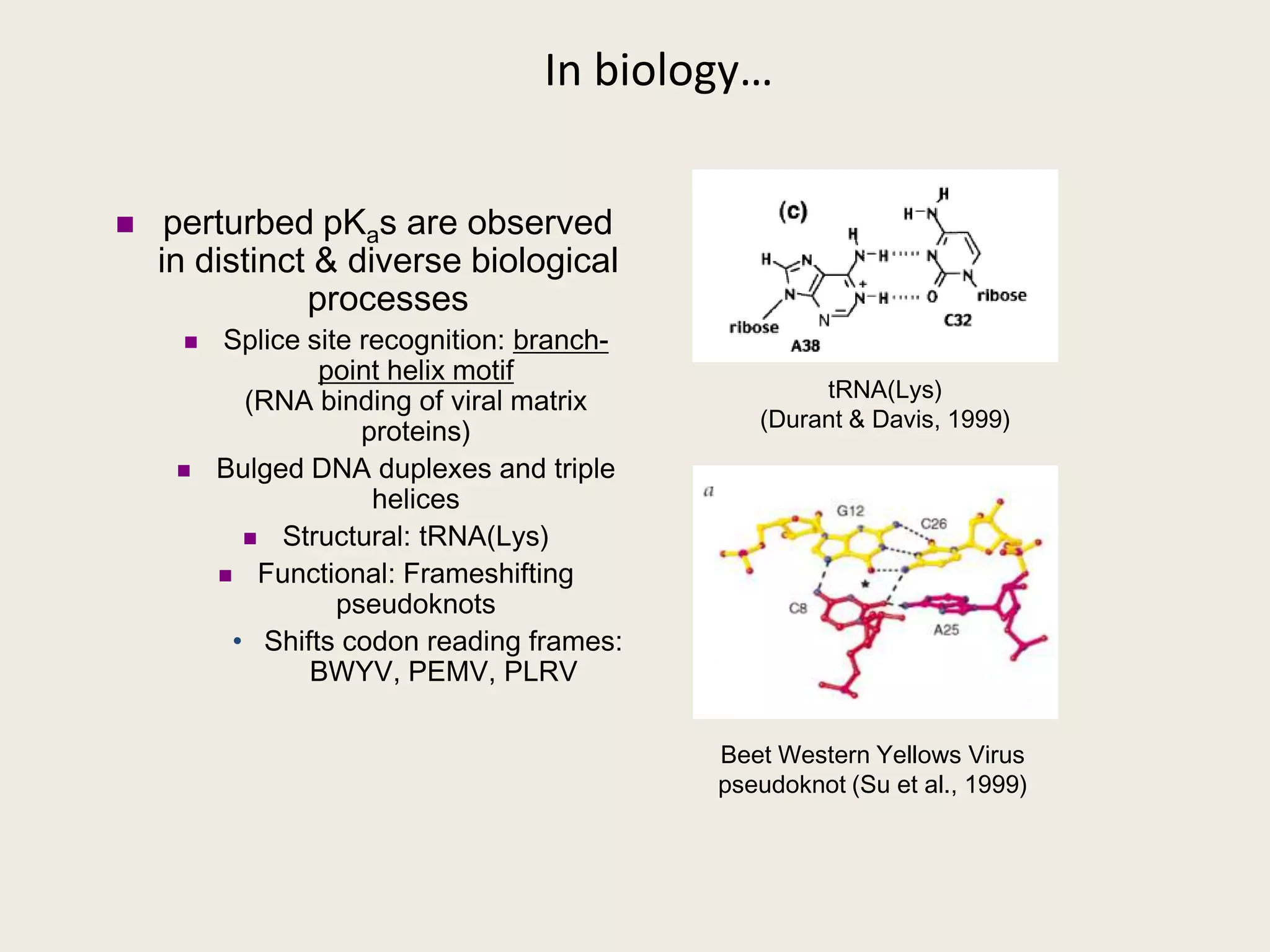The document discusses computational studies related to pKa calculations of proteins and nucleic acids, focusing on the structural aspects that improve sequence alignments. It highlights the complexity of ribozymes, particularly in the context of the hepatitis delta virus (HDV), which relies on specific catalytic mechanisms. The findings emphasize the importance of structural geometry in understanding pKa shifts and the role of electrostatics in determining nucleotide interactions within RNA.