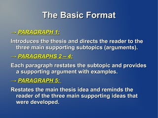 The document discusses the 5 paragraph essay format. It begins with an introduction to the basic 5 paragraph structure, which includes an introductory paragraph, 3 body paragraphs that each discuss a main supporting point, and a conclusion paragraph. It then provides details on developing a clear thesis statement, including characteristics like being specific, narrow, and having a single main point. The document emphasizes that the thesis should guide the overall essay structure by outlining the main points to be discussed in each body paragraph.