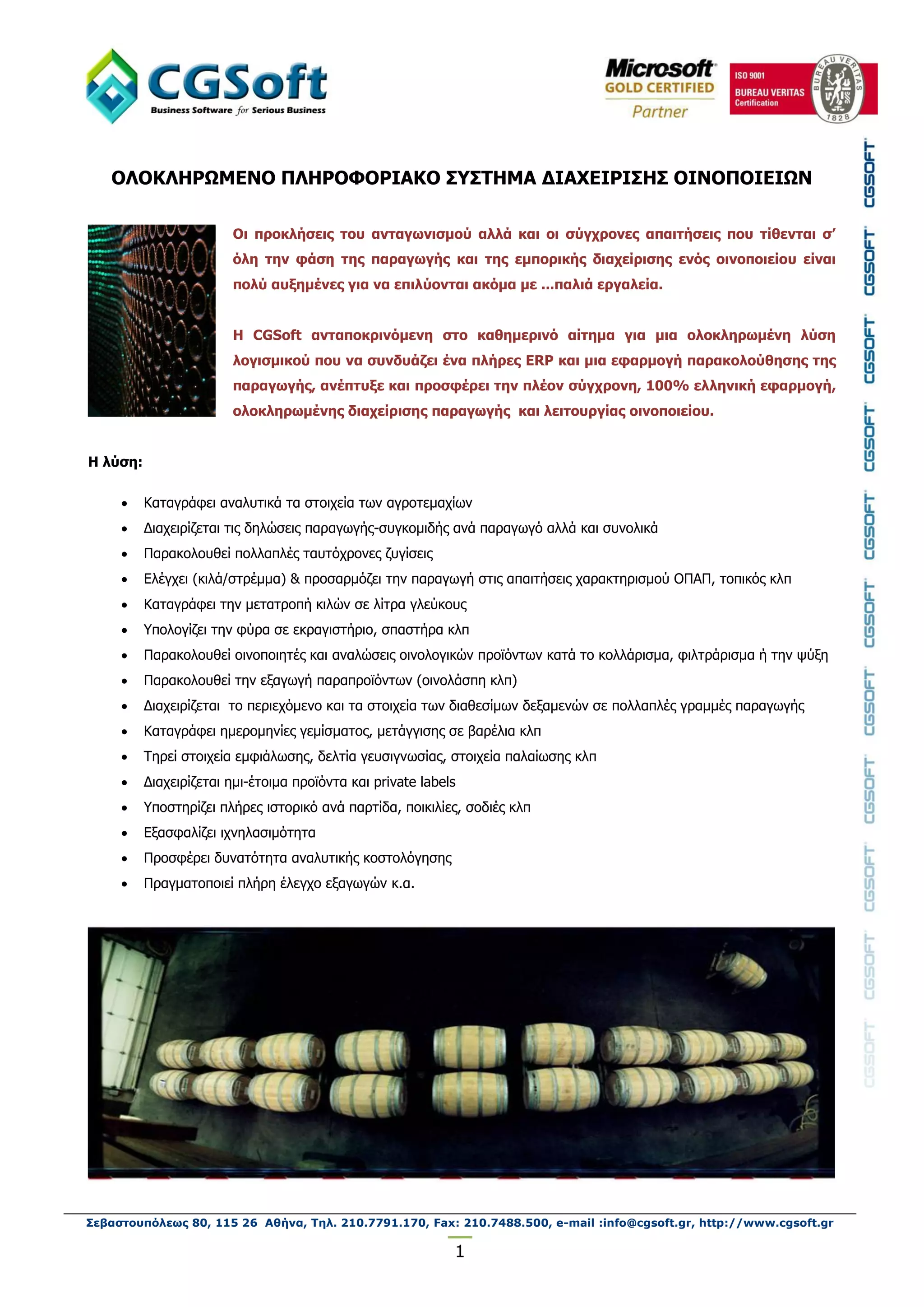 ΔΙΑΥΕΙΡΙΗ ΟΙΝΟΠΟΙΕΙΩΝ Οι πποκλήζειρ ηος ανηαγωνιζμού αλλά και οι ζύγσπονερ απαιηήζειρ πος ηίθενηαι ζ’ όλη ηην θάζη ηηρ παπαγωγήρ και ηηρ εμποπικήρ διασείπιζηρ ενόρ οινοποιείος είναι πολύ αςξημένερ για να επιλύονηαι ακόμα με ...παλιά επγαλεία. Η CGSoft ανηαποκπινόμενη ζηο καθημεπινό αίηημα για μια ολοκληπωμένη λύζη λογιζμικού πος να ζςνδςάζει ένα πλήπερ ERP και μια εθαπμογή παπακολούθηζηρ ηηρ παπαγωγήρ, ανέπηςξε και πποζθέπει ηην πλέον ζύγσπονη, 100% ελληνική εθαπμογή, ολοκληπωμένηρ διασείπιζηρ παπαγωγήρ και λειηοςπγίαρ οινοποιείος. Η λύζη: Καηαγξάθεη αλαιπηηθά ηα ζηνηρεία ησλ αγξνηεκαρίσλ Γηαρεηξίδεηαη ηηο δειώζεηο παξαγσγήο-ζπγθνκηδήο αλά παξαγσγό αιιά θαη ζπλνιηθά Παξαθνινπζεί πνιιαπιέο ηαπηόρξνλεο δπγίζεηο Διέγρεη (θηιά/ζηξέκκα) & πξνζαξκόδεη ηελ παξαγσγή ζηηο απαηηήζεηο ραξαθηεξηζκνύ ΟΠΑΠ, ηνπηθόο θιπ Καηαγξάθεη ηελ κεηαηξνπή θηιώλ ζε ιίηξα γιεύθνπο Υπνινγίδεη ηελ θύξα ζε εθξαγηζηήξην, ζπαζηήξα θιπ Παξαθνινπζεί νηλνπνηεηέο θαη αλαιώζεηο νηλνινγηθώλ πξντόλησλ θαηά ην θνιιάξηζκα, θηιηξάξηζκα ή ηελ ςύμε Παξαθνινπζεί ηελ εμαγσγή παξαπξντόλησλ (νηλνιάζπε θιπ) Γηαρεηξίδεηαη ην πεξηερόκελν θαη ηα ζηνηρεία ησλ δηαζεζίκσλ δεμακελώλ ζε πνιιαπιέο γξακκέο παξαγσγήο Καηαγξάθεη εκεξνκελίεο γεκίζκαηνο, κεηάγγηζεο ζε βαξέιηα θιπ Τεξεί ζηνηρεία εκθηάισζεο, δειηία γεπζηγλσζίαο, ζηνηρεία παιαίσζεο θιπ Γηαρεηξίδεηαη εκη-έηνηκα πξντόληα θαη private labels Υπνζηεξίδεη πιήξεο ηζηνξηθό αλά παξηίδα, πνηθηιίεο, ζνδηέο θιπ Δμαζθαιίδεη ηρλειαζηκόηεηα Πξνζθέξεη δπλαηόηεηα αλαιπηηθήο θνζηνιόγεζεο Πξαγκαηνπνηεί πιήξε έιεγρν εμαγσγώλ θ.α. Σεβαστουπόλεως 80, 115 26 Αθήνα, Τηλ. 210.7791.170, Fax: 210.7488.500, e-mail :info@cgsoft.gr, http://www.cgsoft.gr 1