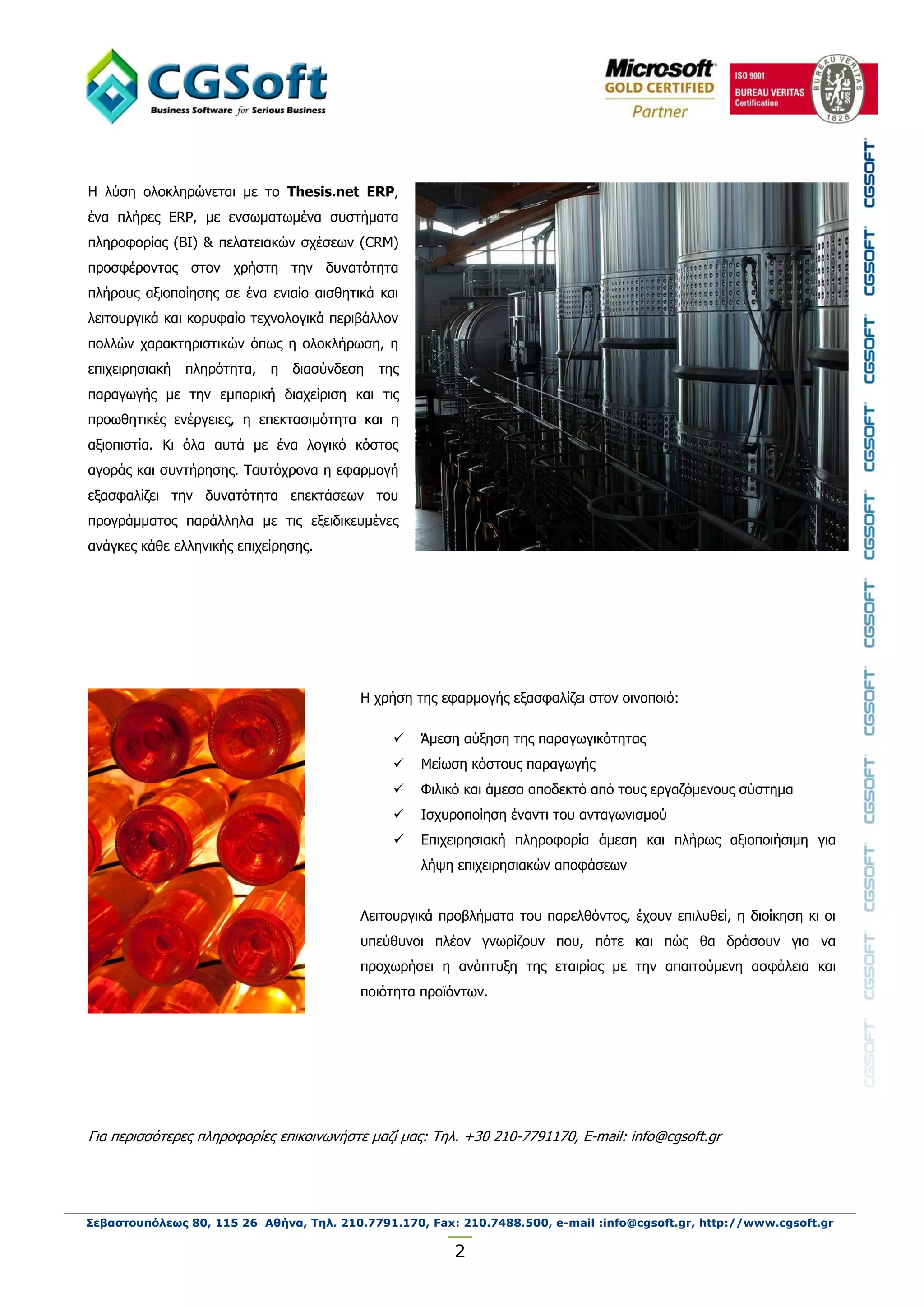 κε ην Thesis.net ERP, έλα πιήξεο ERP, κε ελζσκαησκέλα ζπζηήκαηα πιεξνθνξίαο (ΒΙ) & πειαηεηαθώλ ζρέζεσλ (CRM) πξνζθέξνληαο ζηνλ ρξήζηε ηελ δπλαηόηεηα πιήξνπο αμηνπνίεζεο ζε έλα εληαίν αηζζεηηθά θαη ιεηηνπξγηθά θαη θνξπθαίν ηερλνινγηθά πεξηβάιινλ πνιιώλ ραξαθηεξηζηηθώλ όπσο ε νινθιήξσζε, ε επηρεηξεζηαθή πιεξόηεηα, ε δηαζύλδεζε ηεο παξαγσγήο κε ηελ εκπνξηθή δηαρείξηζε θαη ηηο πξνσζεηηθέο ελέξγεηεο, ε επεθηαζηκόηεηα θαη ε αμηνπηζηία. Κη όια απηά κε έλα ινγηθό θόζηνο αγνξάο θαη ζπληήξεζεο. Ταπηόρξνλα ε εθαξκνγή εμαζθαιίδεη ηελ δπλαηόηεηα επεθηάζεσλ ηνπ πξνγξάκκαηνο παξάιιεια κε ηηο εμεηδηθεπκέλεο αλάγθεο θάζε ειιεληθήο επηρείξεζεο. Η ρξήζε ηεο εθαξκνγήο εμαζθαιίδεη ζηνλ νηλνπνηό: Άκεζε αύμεζε ηεο παξαγσγηθόηεηαο Μείσζε θόζηνπο παξαγσγήο Φηιηθό θαη άκεζα απνδεθηό από ηνπο εξγαδόκελνπο ζύζηεκα Ιζρπξνπνίεζε έλαληη ηνπ αληαγσληζκνύ Δπηρεηξεζηαθή πιεξνθνξία άκεζε θαη πιήξσο αμηνπνηήζηκε γηα ιήςε επηρεηξεζηαθώλ απνθάζεσλ Λεηηνπξγηθά πξνβιήκαηα ηνπ παξειζόληνο, έρνπλ επηιπζεί, ε δηνίθεζε θη νη ππεύζπλνη πιένλ γλσξίδνπλ πνπ, πόηε θαη πώο ζα δξάζνπλ γηα λα πξνρσξήζεη ε αλάπηπμε ηεο εηαηξίαο κε ηελ απαηηνύκελε αζθάιεηα θαη πνηόηεηα πξντόλησλ. Γηα πεξηζζόηεξεο πιεξνθνξίεο επηθνηλσλήζηε καδί καο: Τει. +30 210-7791170, E-mail: info@cgsoft.gr Σεβαστουπόλεως 80, 115 26 Αθήνα, Τηλ. 210.7791.170, Fax: 210.7488.500, e-mail :info@cgsoft.gr, http://www.cgsoft.gr 2