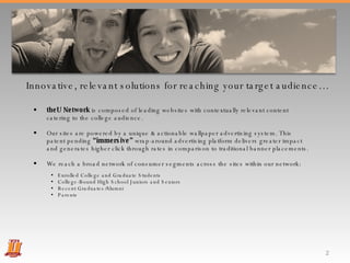 - TheU Network is a collection of websites that reach 8 million unique visitors per month across college students, graduates, parents, and alumni.
