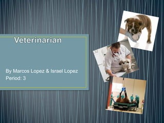A veterinarian treats and cares for animals, examining them to diagnose illnesses and injuries and providing medical or surgical care. They may work in private practice or for government agencies. The job outlook is promising with 36% projected growth between 2010-2020. Veterinarians can specialize in areas like oncology, neurology, or orthopedics. The career requires 4 years of undergraduate education, 4 years of veterinary school, and licensure which involves passing a national exam and obtaining a state license. While the work can be demanding, veterinarians earn a healthy median salary of $82,000.
