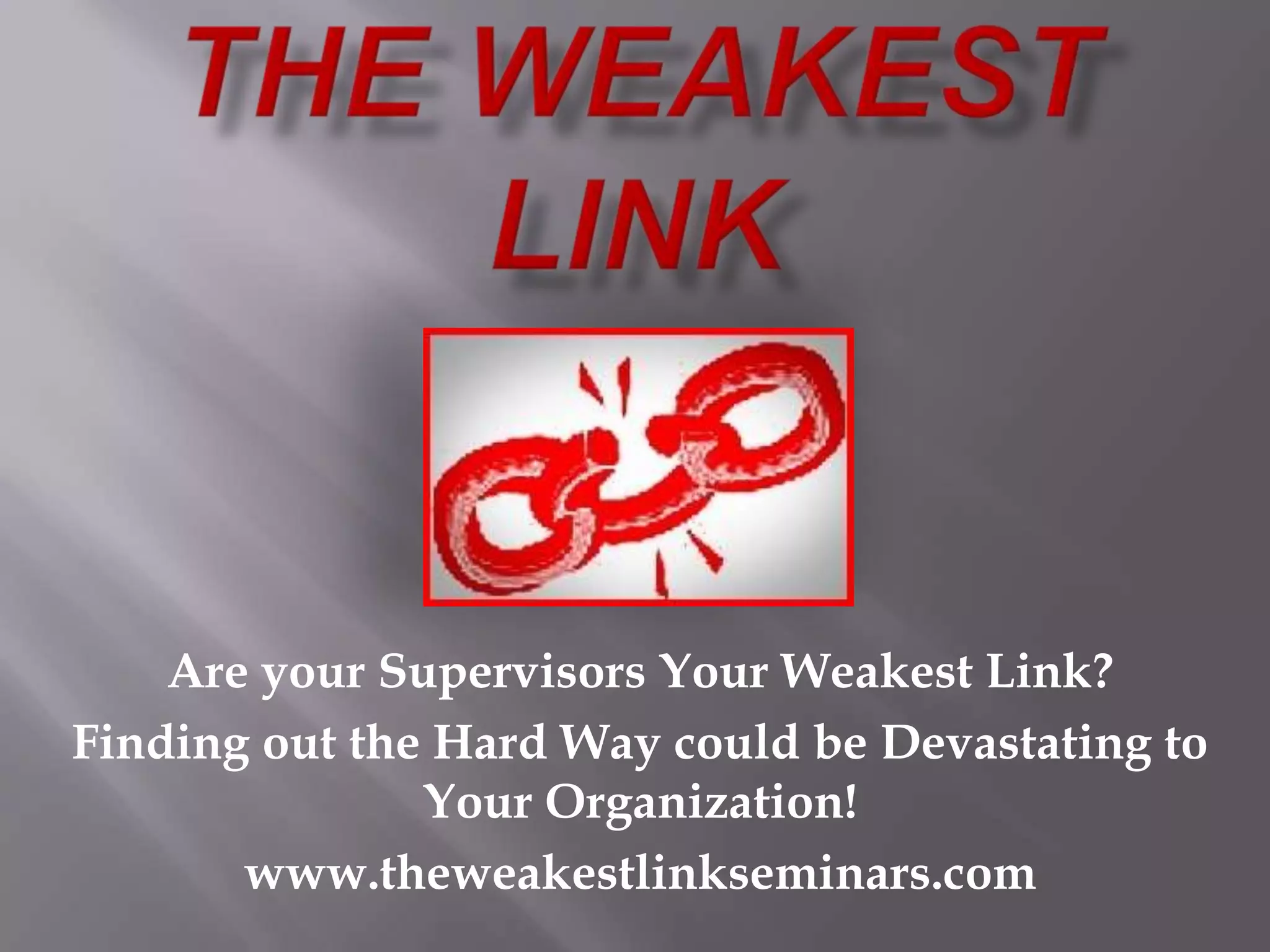 The document discusses how front-line managers and supervisors are often the weakest link in an organization and the largest source of litigation and employee relations issues. It notes that 85% of such issues are directly related to actions or inactions of front-line management. However, these managers frequently receive little training on their legal responsibilities and how to avoid exposing the company to risk. The document advocates for training programs to strengthen front-line managers and thereby strengthen the overall company by reducing liability.
