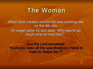 The Lord created woman on the 6th day of creation. An angel questioned why the Lord spent so much time and effort on woman, as her design required her to be washable but not plastic, have over 200 replaceable moving parts, and function on varied foods. The Lord explained that woman must be able to embrace and heal children with just two hands. Though the angel was impressed, he felt the design was too complex for one day. However, the Lord was determined to complete His favorite creation. Woman can think, reason, negotiate, cure herself when sick, and work long hours. Though soft, she is also strong and can endure much. Her ability to cry allows her to express a range of emotions. In