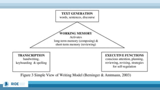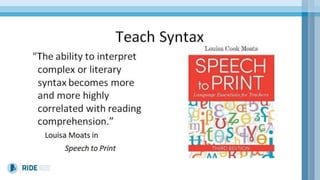 The document discusses how writing instruction can enhance reading comprehension. It presents six principles from The Writing Revolution resource for teaching writing explicitly. These principles emphasize teaching sentence structure from an early age and using writing activities embedded in curriculum content to develop both writing and comprehension skills. The document demonstrates how to apply the principles through sentence expansion exercises in different subject areas. It stresses the importance of practice, feedback, and analyzing student writing to refine instruction.