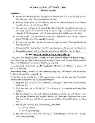 Đề thi lập trình hướng đối tượng yêu cầu sinh viên phát triển một ứng dụng Java với giao diện jframe, xử lý ngoại lệ và lưu trữ dữ liệu ở định dạng nhị phân. Các đề tài bao gồm quản lý mượn sách, đăng ký học, bán hàng tại siêu thị, quản lý nhân sự và thiết bị trong phòng học, với yêu cầu thiết kế lớp và mối quan hệ giữa chúng. Sinh viên cũng được khuyến khích áp dụng kiến trúc MVC và cần xử lý đúng các ngoại lệ khi nhập dữ liệu.