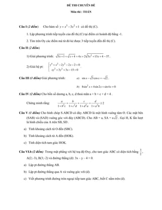 Đề thi gồm các câu hỏi về toán học, bao gồm việc lập phương trình tiếp tuyến và tìm tiếp tuyến cho hàm số, giải các phương trình và hệ phương trình, cùng với chứng minh bất đẳng thức cho bốn số dương. Ngoài ra, đề còn có các câu hỏi liên quan đến hình học không gian và hình học phẳng, bao gồm tính toán khoảng cách và phương trình đường tròn. Nội dung yêu cầu học sinh áp dụng kiến thức toán học để giải quyết các bài tập đa dạng.