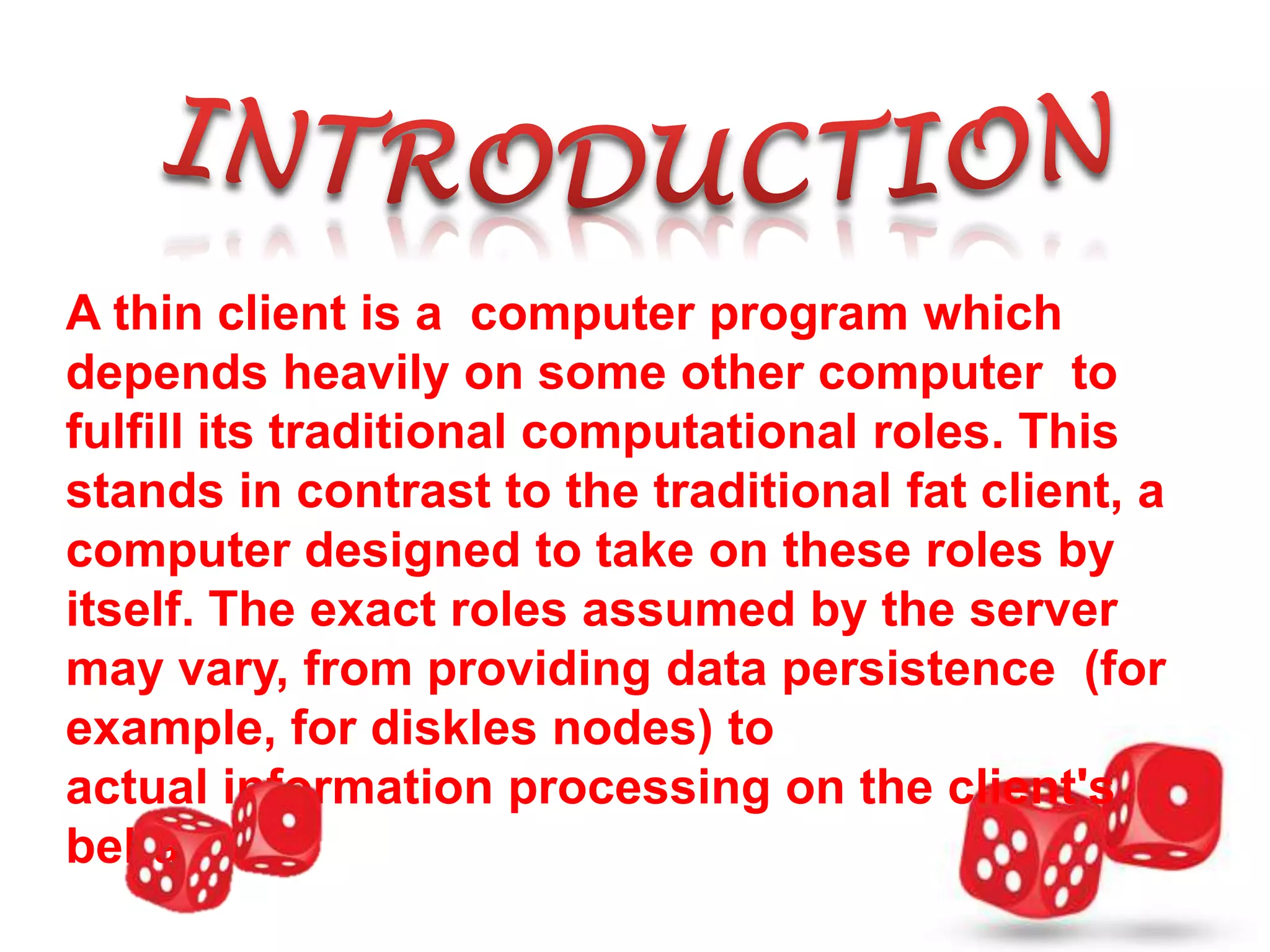 Thin clients are computer programs that rely heavily on a server to fulfill computational roles rather than performing these roles independently like traditional fat clients. Thin clients have their roots in terminals used to access mainframe computers and evolved into graphical user interfaces powered by X server software running on the client. Thin client infrastructures allow computations to be shared across multiple clients connected to a single server, amortizing computing power for improved efficiency.