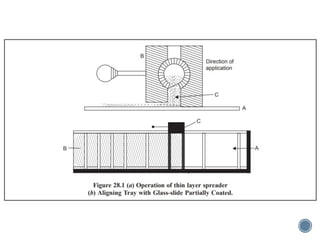 Thin layer chromatography is a technique used to separate mixtures based on differences in how compounds partition between a stationary phase and a mobile phase. It involves coating a thin layer of adsorbent on a plate, spotting samples, and developing the plate in a mobile phase. Compounds separate based on their affinity for the stationary versus mobile phase. Rf values characterize separation and allow identification of unknowns. TLC is useful for analyzing organic compounds, drug purity testing, and reaction monitoring due to its low cost, simplicity, and speed.