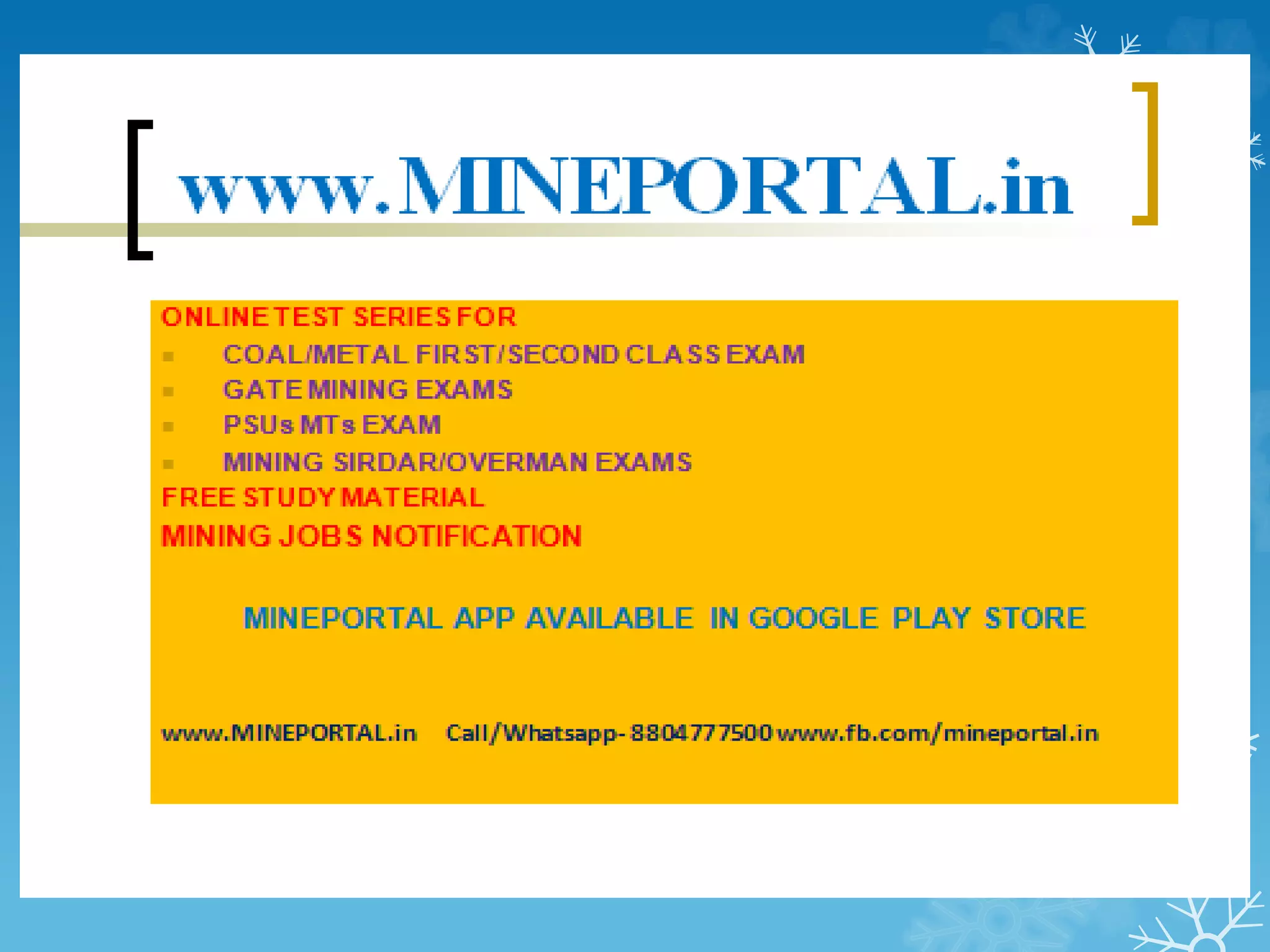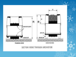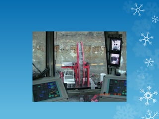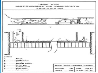 The document discusses thin seam mining techniques such as longwall mining and room and pillar mining. It describes the challenges of thin seam mining and the need for autonomous mining systems without personnel on the working face. Longwall mining offers safety and extraction benefits but has issues with cost and production interruptions. Room and pillar uses continuous miners but managing equipment scheduling is important for efficiency. The document also discusses coal seam detection technologies like natural gamma radiation that help autonomous miners follow the seam boundary.