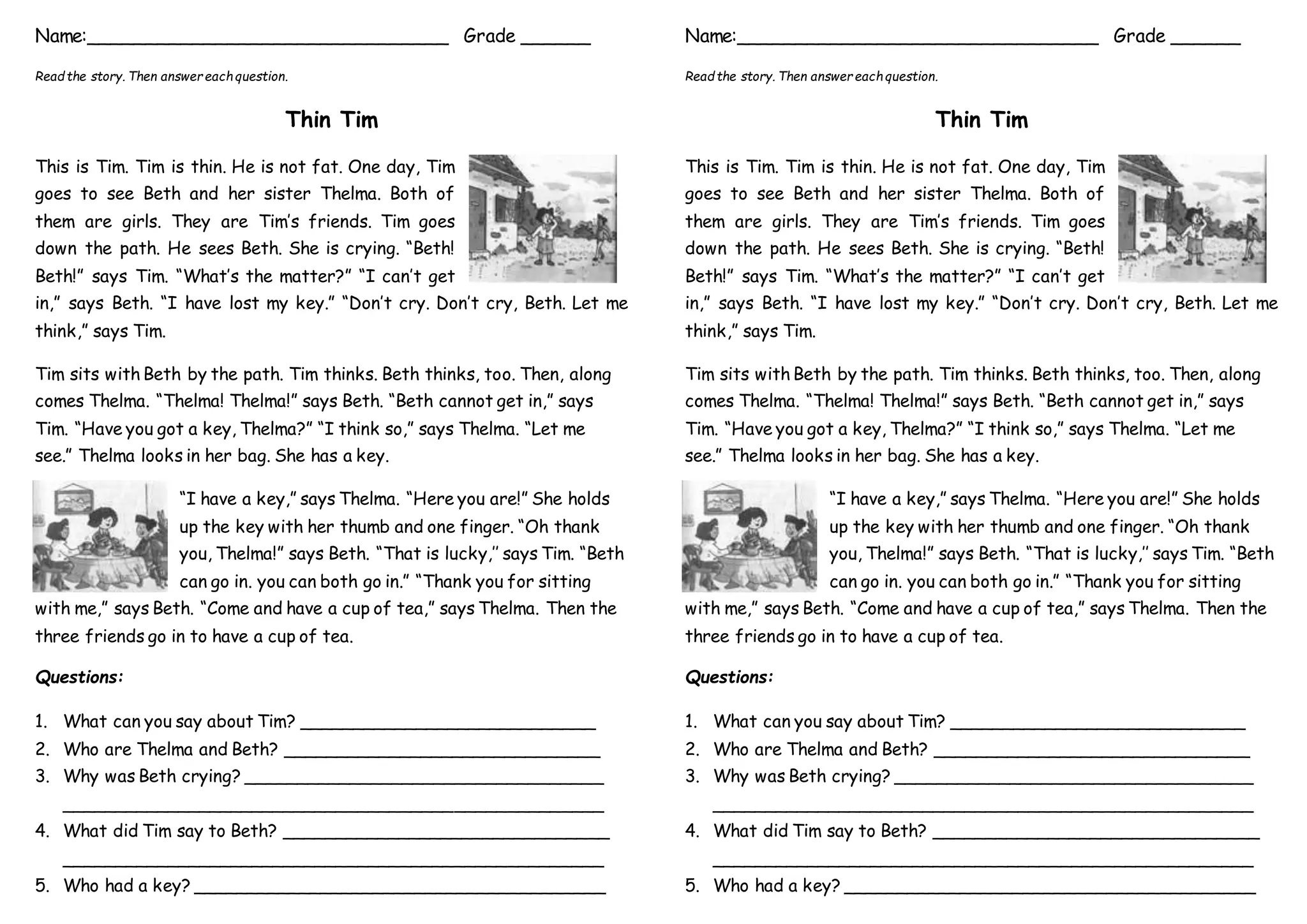 Tim is thin and visits his two friends Beth and Thelma. Beth was crying because she lost her house key and couldn't get inside. Tim comforted Beth while they waited for Thelma. Thelma arrived and had a spare key, allowing Beth to enter her home. The three friends then went inside for tea.
