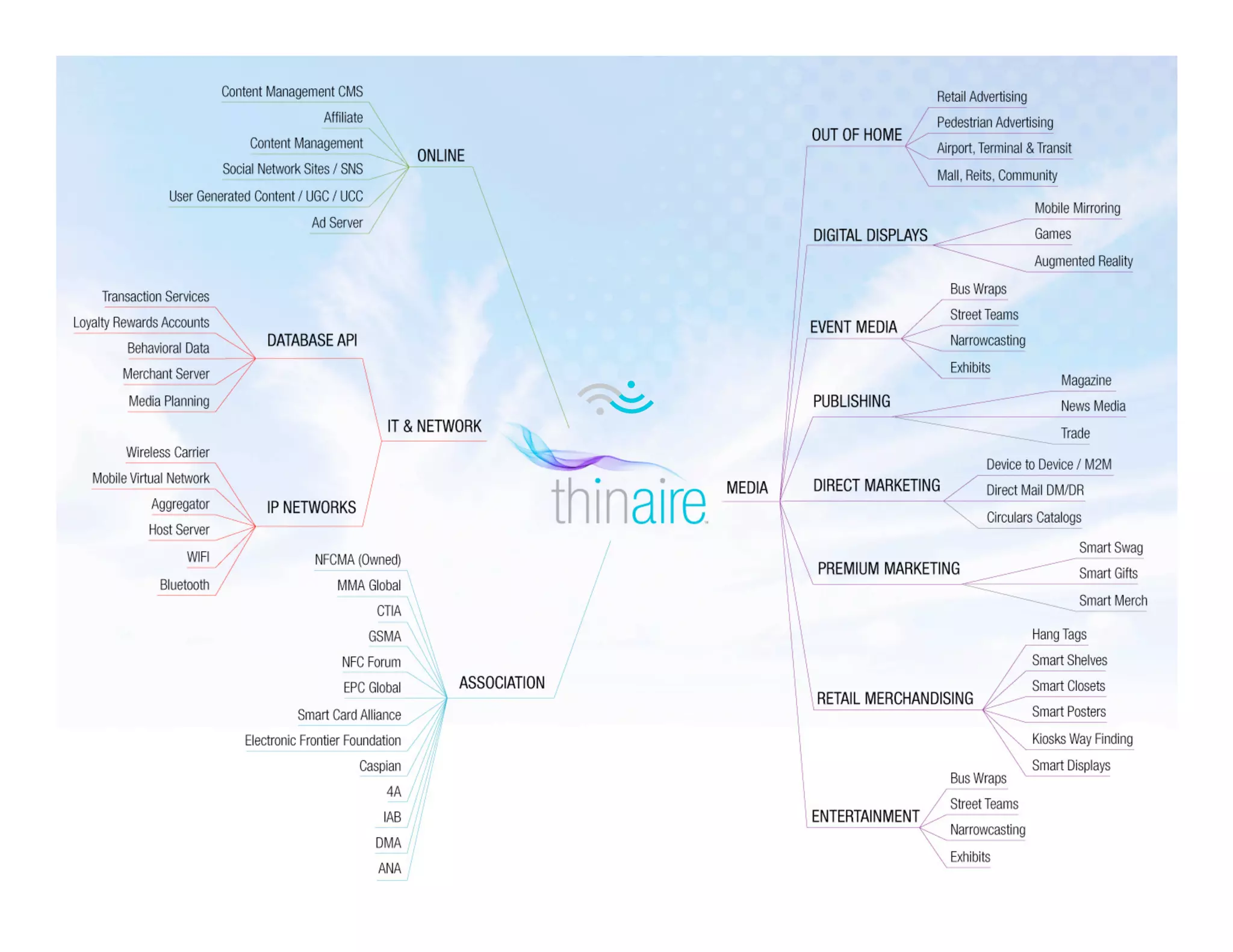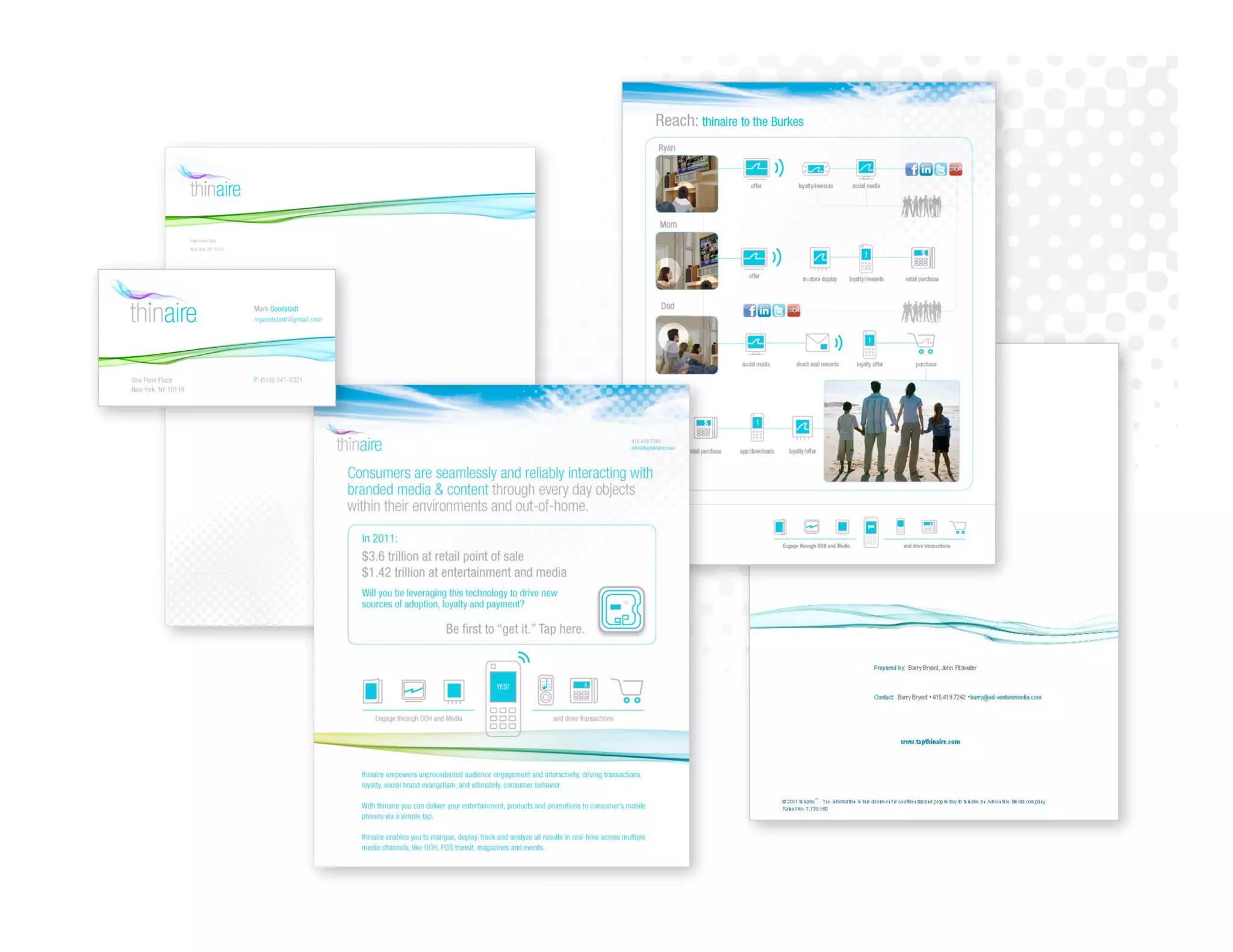 thinaire is a company that uses patented technology to transmit data from traditional advertising media like magazines and billboards directly to mobile devices using radio frequency identification (RFID) tags. This allows the media to become interactive and enables mobile commerce transactions. thinaire's platform allows brands to engage consumers through location-based messaging and offers, track consumer behavior and sales, and extend their reach to mobile. The technology benefits media companies by creating new revenue streams from advertising and monetizing their content through mobile applications and purchases.