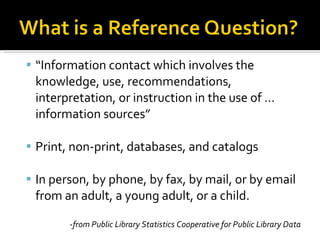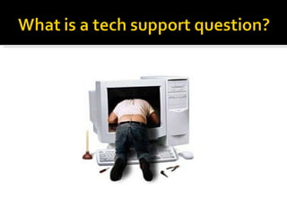 This document discusses how technology support has become an important part of reference services in libraries. It provides examples of common technology questions asked by library patrons and suggests that librarians need to be knowledgeable about both information resources and how to effectively deliver and support access to information, including through technology. The document also offers recommendations for how libraries can enhance their technology support reference services, such as through staff training programs, designating tech support staff, creating tutorials, and developing partnerships.