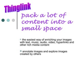 This document discusses how the Thinglink platform can be used for educational purposes. It provides examples of how teachers can use Thinglink to: 1) have students annotate images and videos with text, links, and media to demonstrate learning; 2) create interactive lessons and student projects; and 3) organize student work and resources into channels, groups, and portfolios for assessment. Teachers are also shown how to manage student accounts and sharing options within the Thinglink platform.
