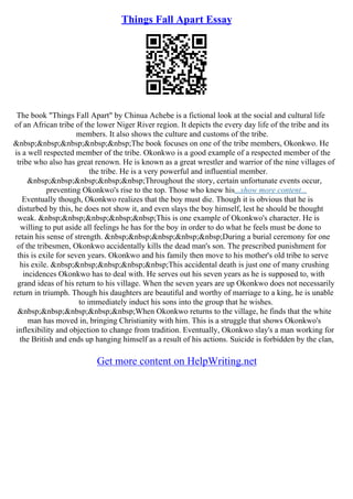 In Chinua Achebe's 'Things Fall Apart,' the main character Okonkwo struggles against his fear of weakness and his father's legacy, leading to his tragic downfall. The novel illustrates the clash between traditional Ibo culture and the changes brought by British colonization and Christianity, which Okonkwo vehemently opposes. Ultimately, his refusal to adapt results in personal and societal collapse, culminating in his suicide, which symbolizes the broader disintegration of his culture.