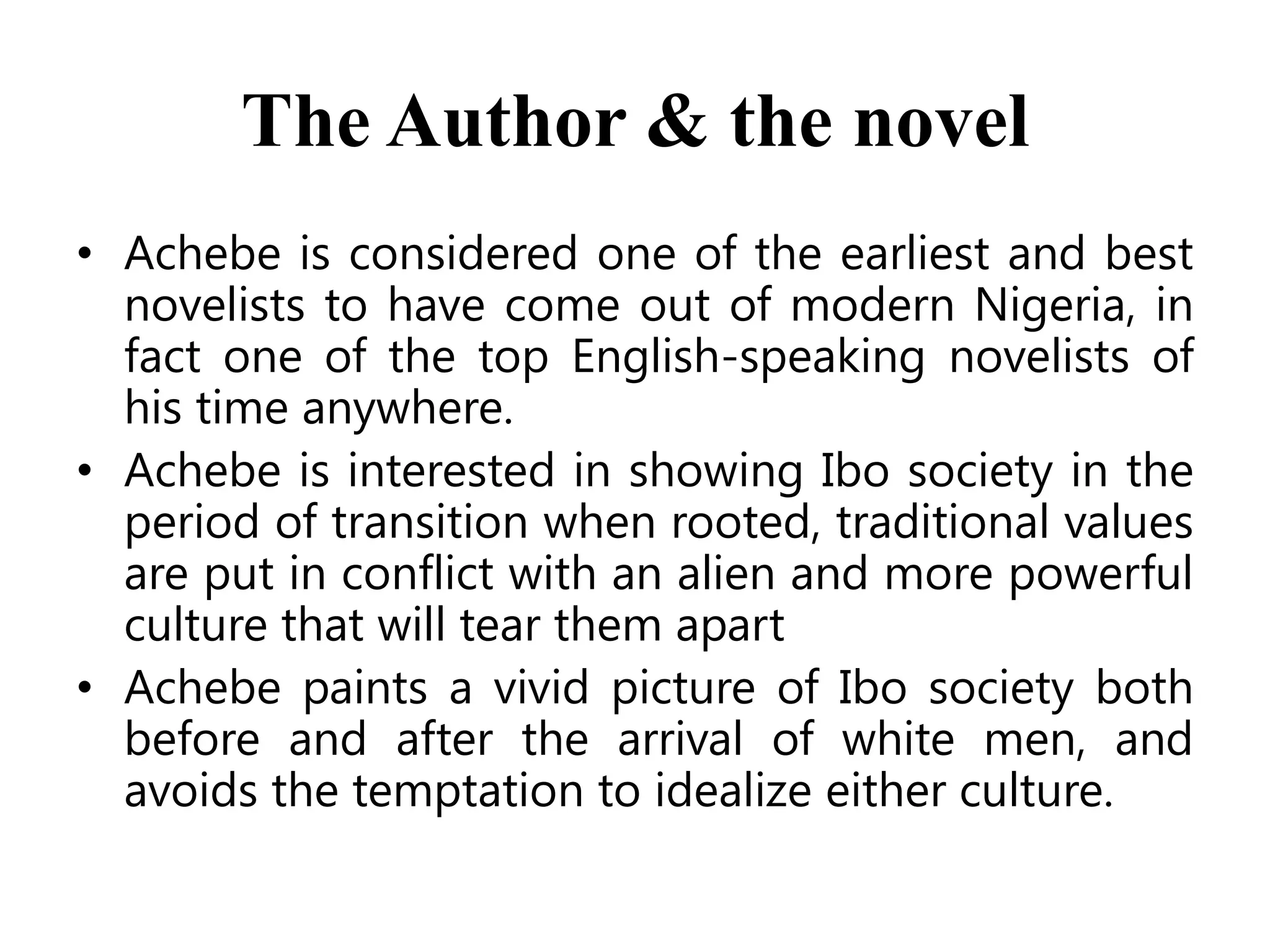 Things Fall Apart by Chinua Achebe is set in 1890s Nigeria and depicts the clash between European colonialism and Igbo culture. The main character, Okonkwo, strives to be the opposite of his father through hard work and masculinity defined by aggression, anger, and violence. However, his tragic flaw leads to his downfall when he kills a clansman, violating the Week of Peace. The novel explores Igbo traditions and oral storytelling, as well as the differing perspectives of Okonkwo, his son Nwoye, and daughter Ezinma on masculinity and the arrival of European missionaries.