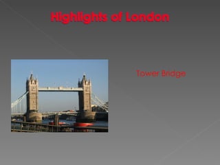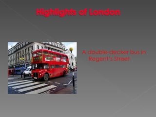 This document lists iconic London landmarks such as a double-decker bus, Tower Bridge, the London Eye, the tube, Saint Paul's Cathedral, a telephone box, Piccadilly Circus, Big Ben and the Houses of Parliament, the National Gallery, Marble Arch, Buckingham Palace, Hyde Park, and Westminster Abbey.