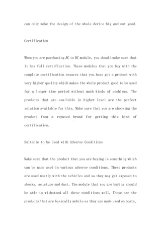 The document discusses factors to consider when choosing an AC-DC module, including size and weight, certification, and ability to withstand adverse conditions. AC-DC modules can replace conventional adapters and transformers, but consider that smaller, lighter modules are best for portable devices. Modules should have full certification to ensure high quality. The module also needs to withstand shocks, moisture, and dust if used in vehicles. The document also mentions operating temperature range and power output as important specifications.