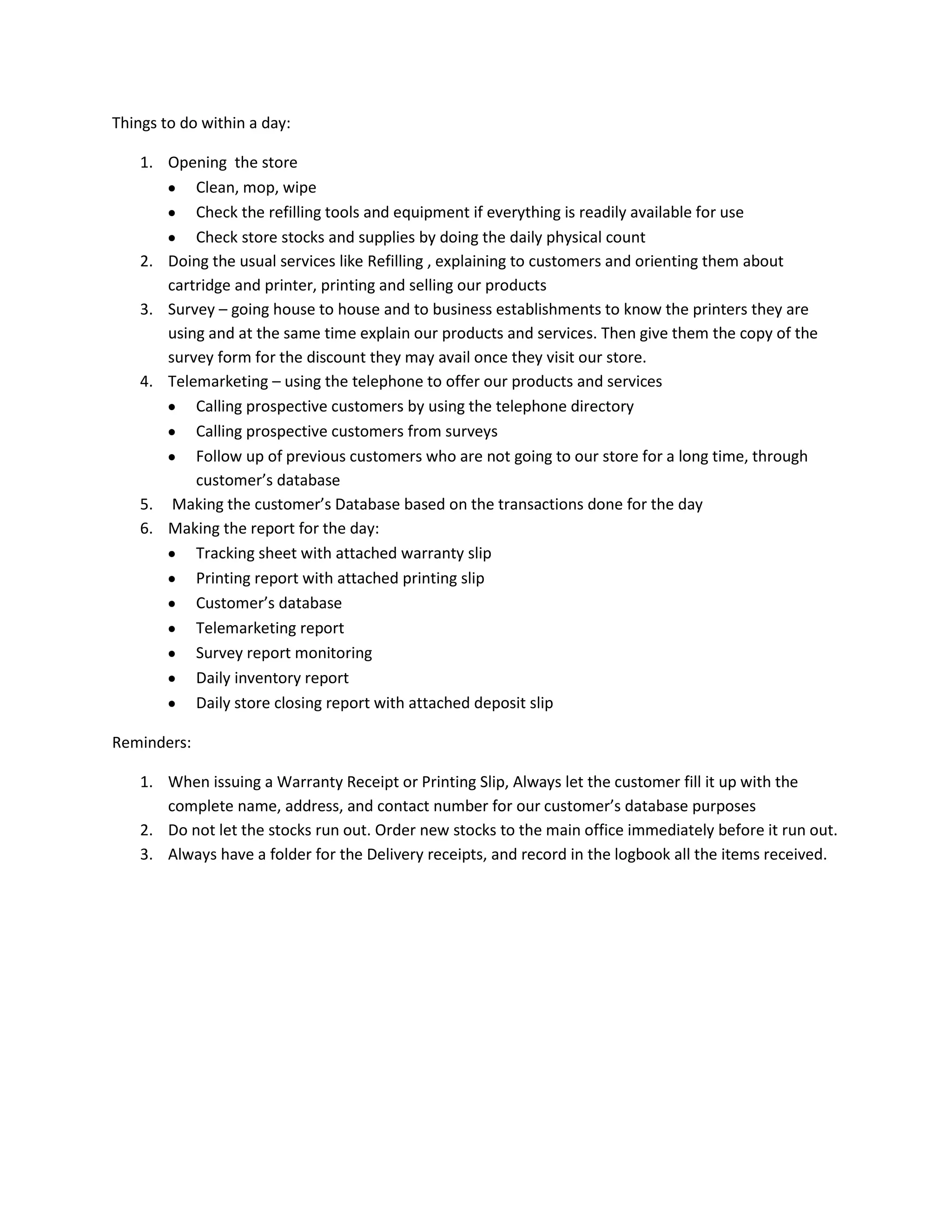 1. The document outlines daily tasks for a store including opening procedures, customer services, surveys, telemarketing, and creating daily reports.