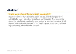 The document discusses scalability challenges and solutions for web architectures, emphasizing the importance of high performance in delivering web-based systems. It covers concepts such as vertical and horizontal scalability, load balancing methods, and the impact of caching and edge computing on performance. Additionally, key elements like performance testing, reliability, and the trade-offs between consistency and availability in data management are highlighted.