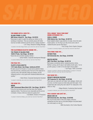 The document provides recommendations for restaurants and things to do in San Diego, as suggested by various individuals. For dining, it recommends Mexican, fine dining, speakeasy, French, burger, jazz bar, Brazilian BBQ, pizza, sushi, build-your-own, ethnic, tacos, and bakery/cafe options. For activities, it suggests staying downtown, exploring areas like La Jolla Coves, Coronado Island, Old Town, the San Diego Zoo, and hiking Potato Chip Rock. It also lists the USS Midway Museum, dueling piano bar, and harbor cruises as additional options.