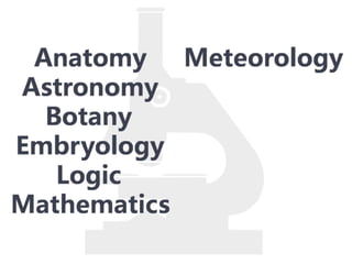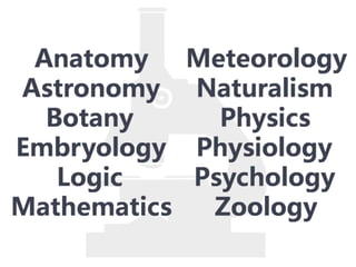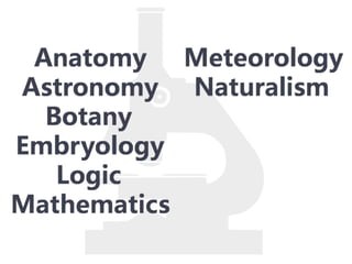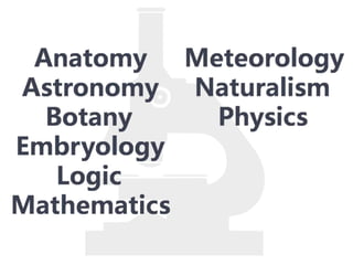 #121 Aristotle developed many natural sciences because of this belief, for he believed that the only way to find knowledge, truth, and meaning was to study a form of a thing, and by studying its form, to discover its essence. Aristotle believed that to find the universal, you have to examine the particular, for the particular reaches for and points to the ultimate. In trying to discover the ultimate, Aristotle studied nearly everything and developed many sciences including…