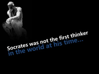 #48 However, he was not the first thinker in the world at the time. There are many notable pre-Socratic philosophers and eastern philosophers that preceded Socrates. Man had been on the earth for several thousand years before Socrates. Socrates was not the first man to think. However…