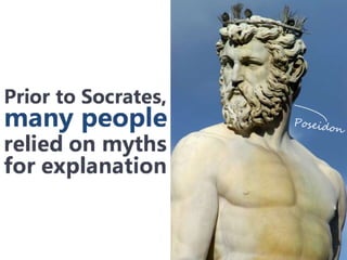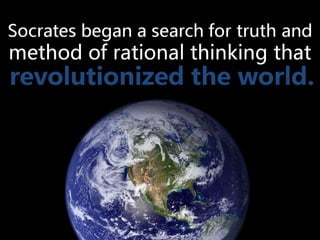 #50 Socrates was not satisfied with simply accepting the world as it was. He desired to understand it, and to understand the way people thought about it. So he began a search for truth and emphasized rational thinking, and this sparked a revolution in the world.