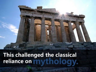 #57 And this movement he started began to slowly uproot people’s long-held reliance on mythology. He certainly did not overthrow mythology as a whole, and it was not his goal to do so, but as people began to think more about the world around them, they began to find a new understanding of it and didn’t have to resort as often to mythical forces for explanations. Thus, they did not have to rely as much as places like this building here…