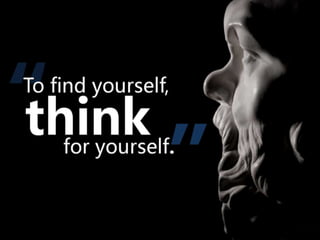 #59 Socrates said, “To Find yourself, think for yourself.” Socrates believed one cannot just accept the world as it comes at him. He must think in order to understand and to find a true glimpse of truth and the meaning of life. This then passed down the tradition that thinking rationally was a necessary aspect of living.
