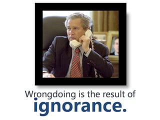 #64 Thus, wrongdoing is the result of ignorance. He did not mean that people were stupid and made stupid decisions. Rather, they had a rational ignorance, in that they made decisions they thought were good and rational, however, they had an ignorance of truth. Improper conduct is a product of our ignorance of the truth rather than a weakness of the will. As you can, Bush here wants to do what is good, he desires to make a phone call, but he just lacks the knowledge of how to make a phone call. Therefore his ignorance leads to wrongdoing.
