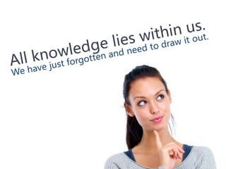 #69 Socrates believed that all knowledge lies within all people. No one can learn anything new, and nothing can be taught because everyone already knows everything. However, we have just forgotten it and need to draw it out. We draw it out by questions. Socrates believed that souls were eternal and are reincarnated. Each time we are reborn we forget our knowledge. We must ask questions to draw out all the knowledge from our past lives. If one asks the right questions, he will find the right answers. This introduced the world to the concept of continually challenging your beliefs with questions. Because Socrates believed we will only do the right things if we know the right things, he believed it was critical to continuously question what we think we know in order to find true knowledge. Socrates also never offered any answers to his questions after questioning and tearing down a person’s ideas because he believed the answers were already within the person and he couldn’t give it to them; they could only truly find it by drawing it out themselves. Giving the answer to them would not be true knowledge.