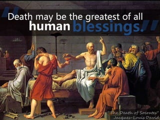 #73 He said that “Death may be the greatest of all human blessings.” Perhaps he believed this because he believed that every time we die we are reborn and have the opportunity to live a new life and again pursue the sacred quest of truth. Whatever the reason, he willingly embraced his punishment. Surrounded by a group of his students, he downed a wine mixed with the poison of a hemlock, and died. He spoke his last words to his student Crito, saying “We owe a cock to Asclepius. Please, don’t forget to pay the debt.” Asclepius was the Greek god for curing illness, and it is likely that Socrates’ spoke these last words because he believed death was a cure, a freedom of the soul from the body and the opportunity to begin again. Although we as Christians do not believe Socrates was reborn in another life and privileged to live on, his ideas certainly were.