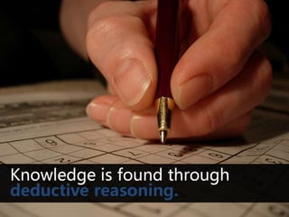 #187 Thank you very much.I hope you learned. This was a presentation by Matthew Redmond.All content was derived from studies within Oral Roberts University’s philosophy program, headed by Dr. Thorpe. The presentation was made for and presented in the class “History of Quantitative Thought” taught by Dr. Halsmer and Dr. Vickery. The books read in that class (A Comprehensible Universe by Coyne and Heller, Is God a Mathematician? by Mario Livio, and A History of Mathematics by Luke Hodgkin) also contributed to and inspired the information in this presentation. General information about the philosophers was also found on Wikipedia Encyclopedia. Finally, all other research came from my own personal studies, and includes information learned from works by Plato and Aristotle and works on philosophy.Many of the images used in this presentation were purchased from 123RF.com, but some also came from the Flickr Creative Commons, and searches performed on Google Images.The ideas for the presentation design were inspired by Apollo Ideas, Inc. (http://www.apolloideas.com/), which is famous for its presentations “shifthappens” and “thirst,” both of which won World’s Best PowerPoint Awards. For instance, the “Now You Know” and “Definition of Think” slides were both directly taken from Apollo design ideas. Other presentation ideas came from Presentation Zen (http://presentationzen.blogs.com/) which is a great blog on creating impactingPowerPoints. Finally, I must also give much thanks to SlideShare.com for providing a center for presentation uploads, and I have looked through countless presentations which I know have contributed to my design.This presentation was used for nothing other than a class project I did and presented at my university.