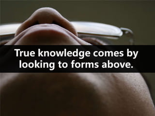 #90 Because the world is an imperfect shadow, observation of the world will only lead to imperfect ideas. If one seeks knowledge experientially or by observation, he will find only opinions rather than true knowledge. This world is in a state of flux, so the views derived from it also will always be changing and thus instable opinions. The phenomena we perceive with our senses is imperfect and leads to imperfect knowledge.