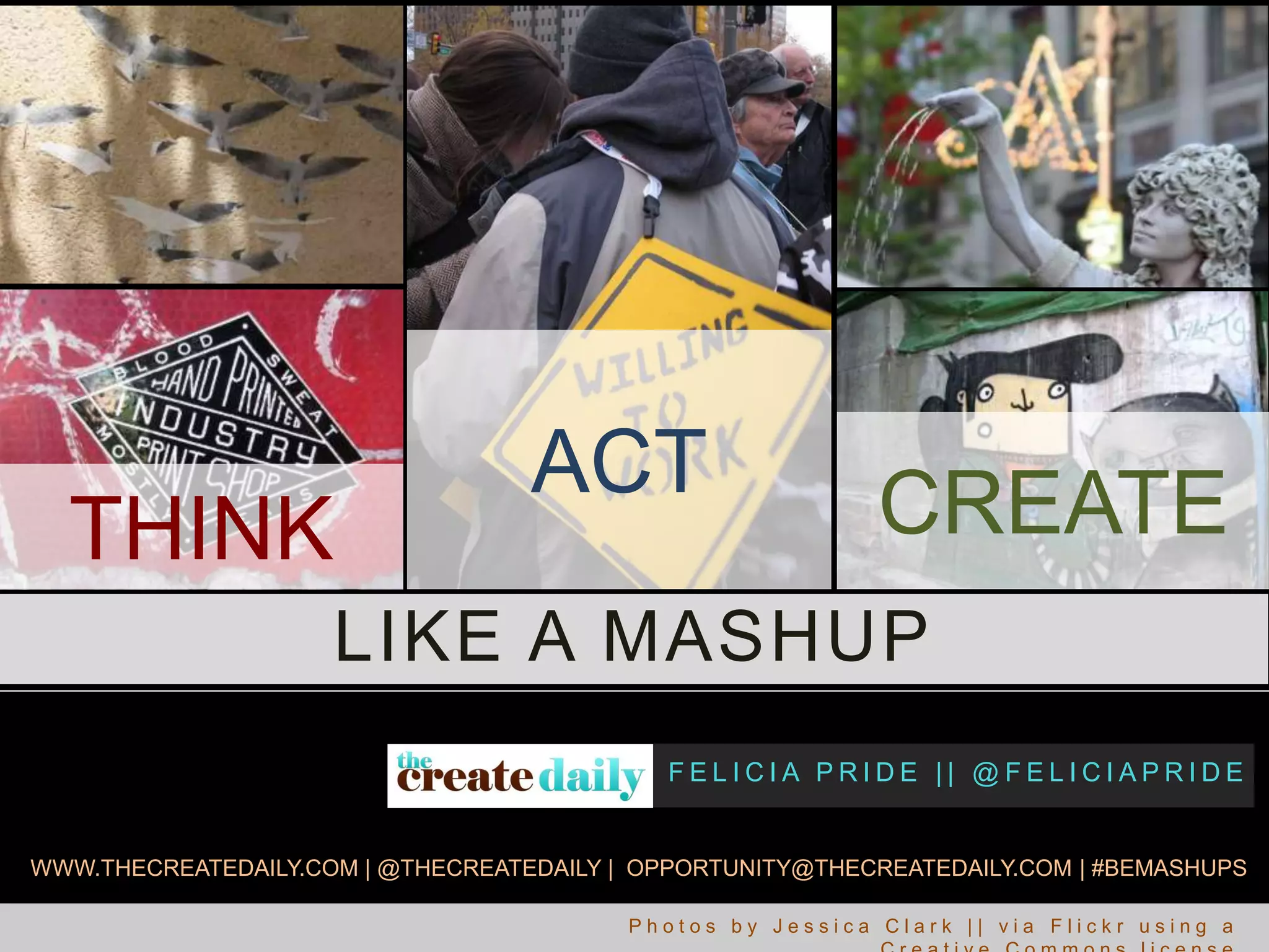 The document discusses the concept of 'mashup,' describing it as a combination of various elements, often in media and technology. It highlights the evolving nature of jobs and skills in the modern workforce, where individuals may hold many different roles throughout their careers. The piece encourages creativity and collaboration, advocating for an open-minded and interdisciplinary approach to personal and professional growth.