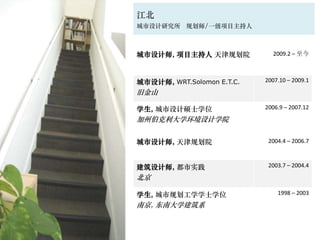 江北是一位经验丰富的城市设计师,参与多个重要项目并获得多项奖项,包括美国建筑规划协会金奖。他的设计理念强调在城市设计中关注场所,倡导思维创新并注重细节。文档还涉及了他的教育背景和项目经验,以及对城市设计的深刻洞察。