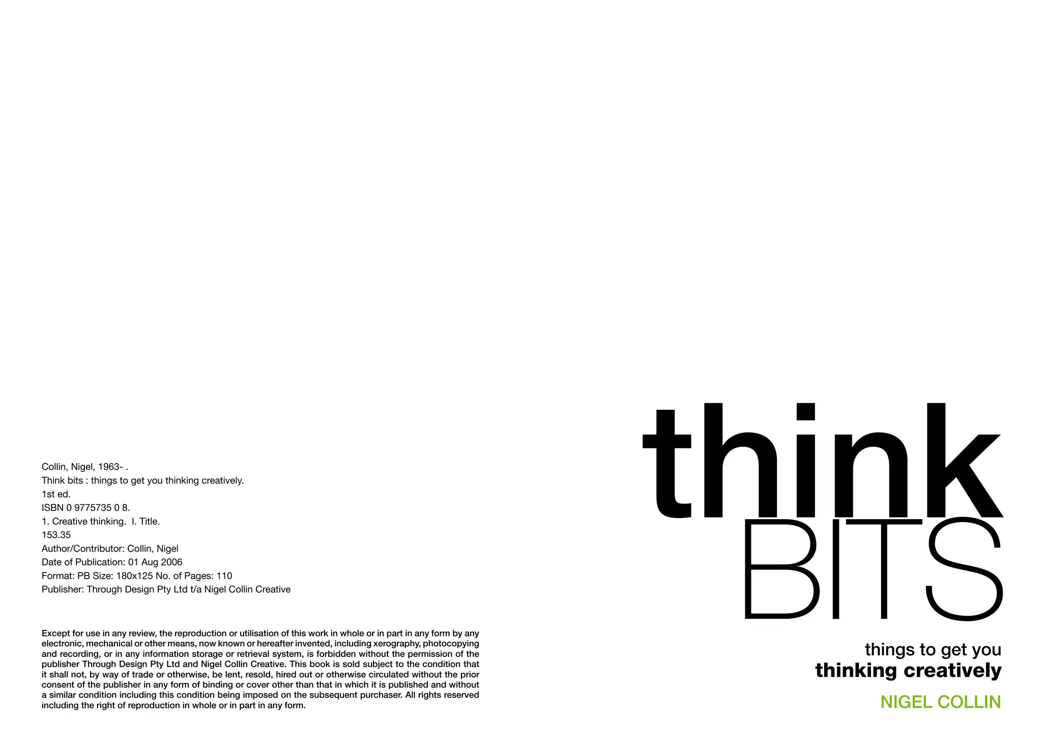 This document provides biographical information about Nigel Collin, author of the book "Think Bits". It describes his background working in events and entertainment. It explains that Think Bits is a collection of prompts and exercises to help people think more creatively in business and life. The document shares quotes praising Nigel's approach to problem solving and viewing the world differently. It provides contact information for Nigel Collin Creative.