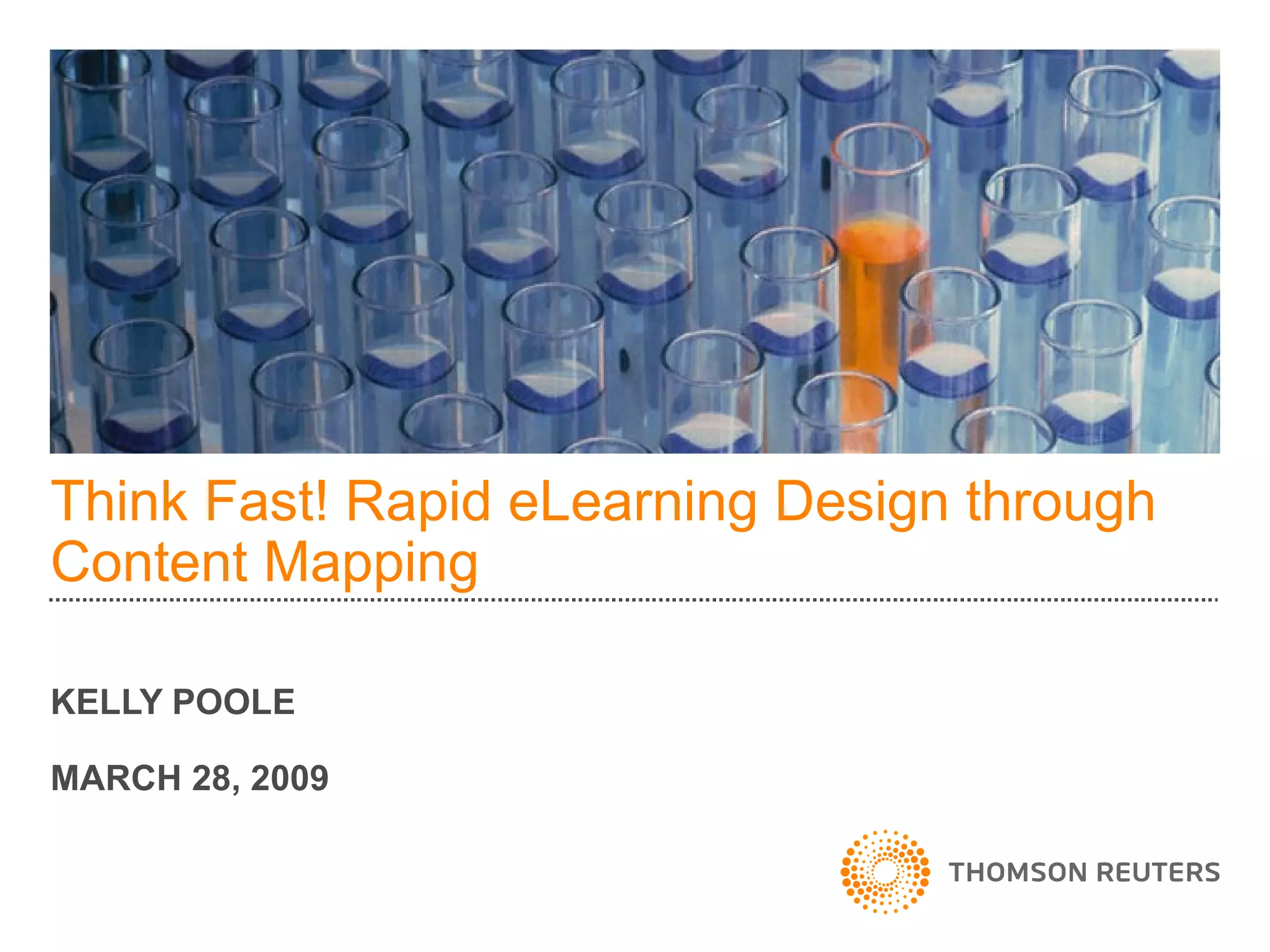 The document discusses rapid eLearning design through content mapping. It introduces the ADDIE model of instructional design and Kirkpatrick's model of evaluation. It then demonstrates applying these models to a mock course on conducting TV interviews. Key steps include analyzing the content, creating objectives, and planning interactivity and assessment. The goal is to provide a proven methodology for efficiently designing instructional content.