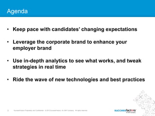 The document discusses how companies can take a more strategic, marketing-focused approach to recruiting. It recommends that companies (1) keep pace with changing candidate expectations, (2) leverage their corporate brand to enhance their employer brand, and (3) use in-depth analytics to measure the effectiveness of recruiting channels and strategies in real time.
