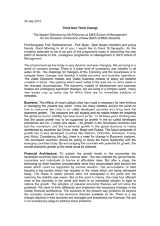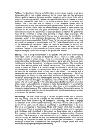 The document summarizes the need for new thinking across many domains due to increasing change and complexity in the world. It discusses how economic models, business models, financial architecture, politics, society, technology, environment, and legal systems need to evolve and change approaches to address issues like global economic crises, debt burdens, unemployment, pollution, and inefficient legal processes. New ideas and evolutionary approaches are needed across many areas to successfully navigate the dynamic environment.