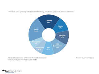 Social media is increasingly prevalent in both personal and professional lives. Over half of UK adults use social networks, and nearly all employees use social media for work. While many organizations block social media access, fewer will do so in the future. Social media allows for new forms of collaboration and value creation through crowdsourcing, crowdfunding, social customer care, and open leadership. Adopting social practices can improve knowledge sharing, problem solving, innovation, and employee engagement. Organizations that embrace social media may see benefits like new products and revenue, better business outcomes, and lower employee turnover.