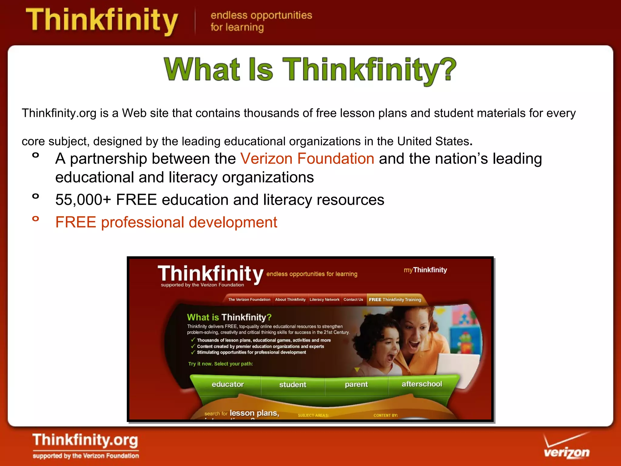 Thinkfinity.org is a website that provides over 55,000 free educational resources including lesson plans, student materials, and professional development for teachers. It is a partnership between the Verizon Foundation and leading educational organizations focused on subjects like math, reading, science, and literacy. The website contains standards-based lesson plans, online and printable materials, and links reviewed by education partners to support both classroom learning and literacy programs.
