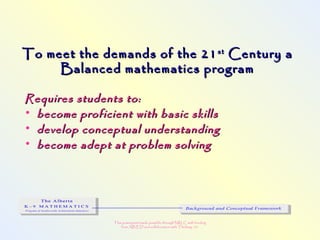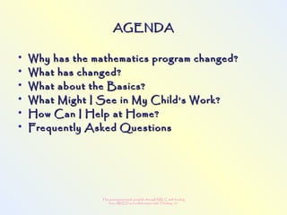 The document discusses changes to the mathematics program to better prepare students for the 21st century. It focuses on developing number sense, conceptual understanding, and problem solving skills rather than memorization. Students will learn through activities that build relationships and understanding, like using area models to represent multiplication and see connections between facts. Parents may see different types of learning activities aimed at developing understanding over practicing routines.