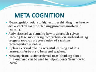 This document discusses different types of thinking including perceptual/concrete thinking, abstract thinking, reflective/logical thinking, creative thinking, critical thinking, convergent thinking, and divergent thinking. It defines thinking according to various scholars and describes the key characteristics and processes of different thinking types. The document also outlines stages of creative thinking and ways to develop creative thinking in pupils, as well as components and skills of metacognition such as metacognitive knowledge, regulation, experience, awareness, planning, monitoring and evaluating.